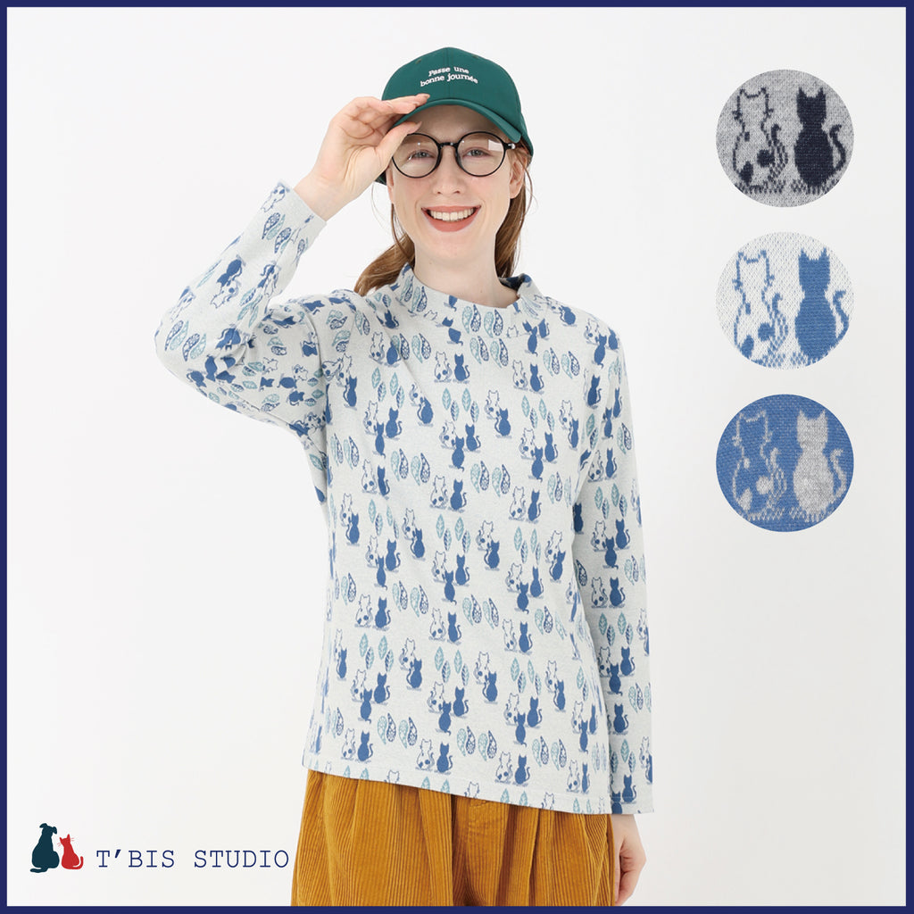 【LLサイズあり】【日本製】長袖ネコ柄微起毛ダブルジャカードハイネックPO 157402