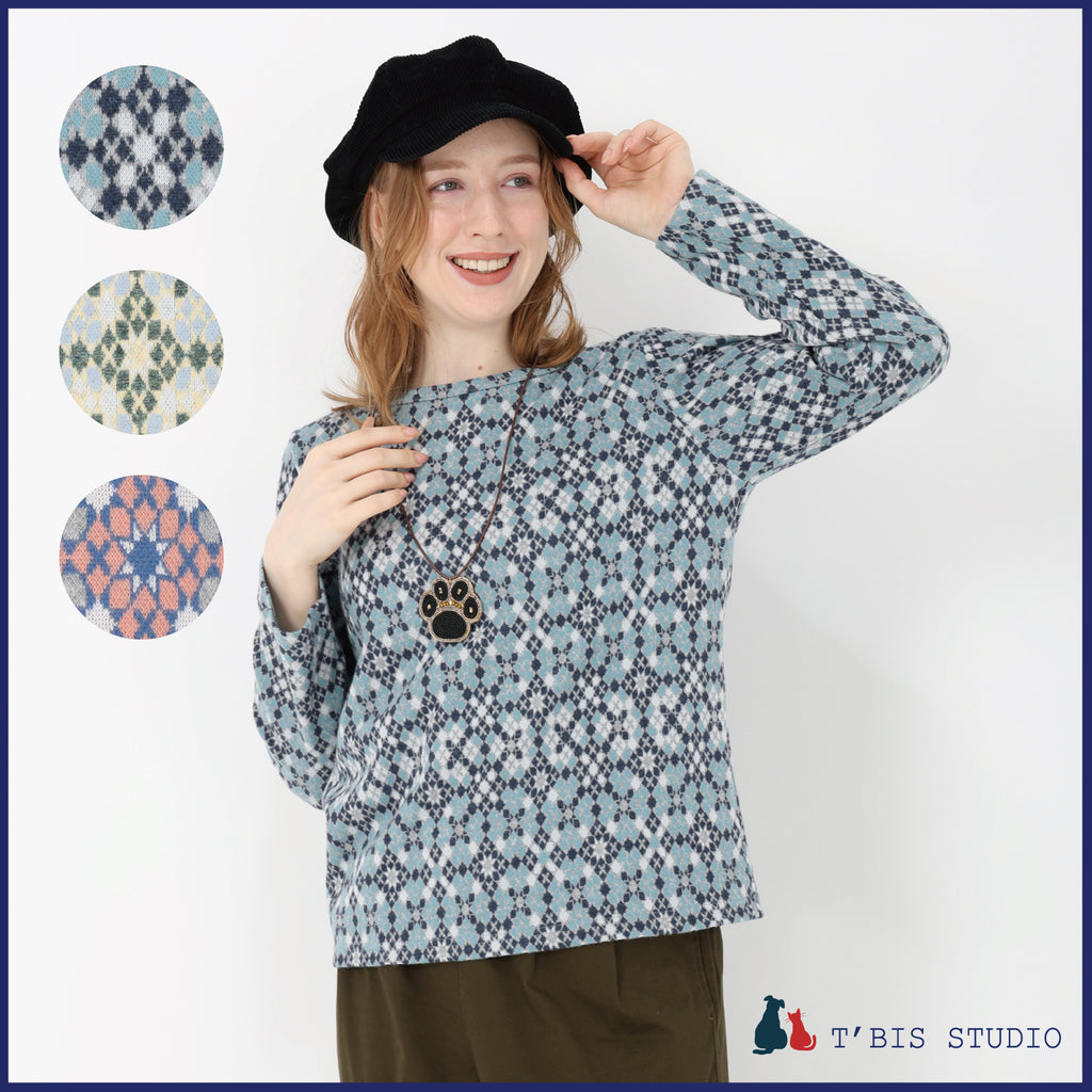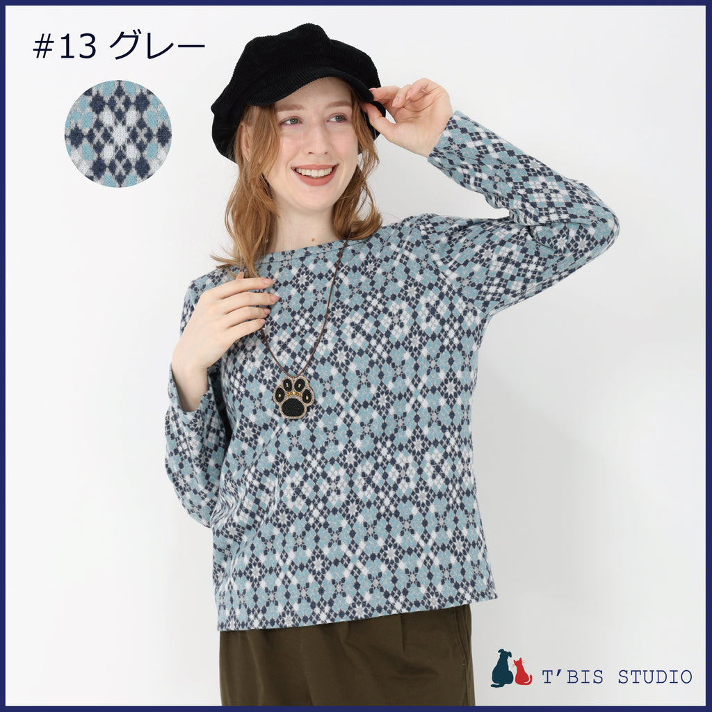 【日本製】長袖モザイク幾何柄微起毛Wジャカードクルーネックカットソー 157407
