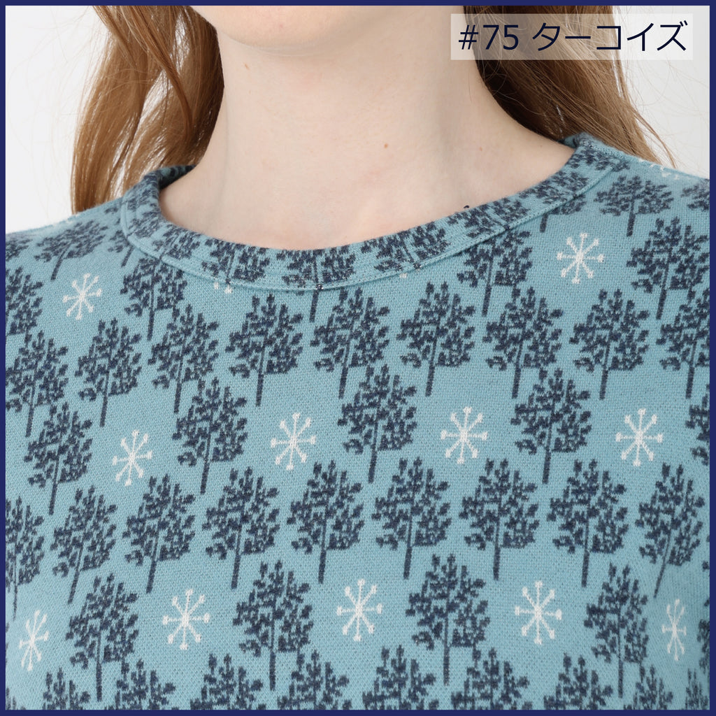 ・北欧の森の雪景色を表現した柄が冬らしい雰囲気を演出するクルーネックプルオーバーです。