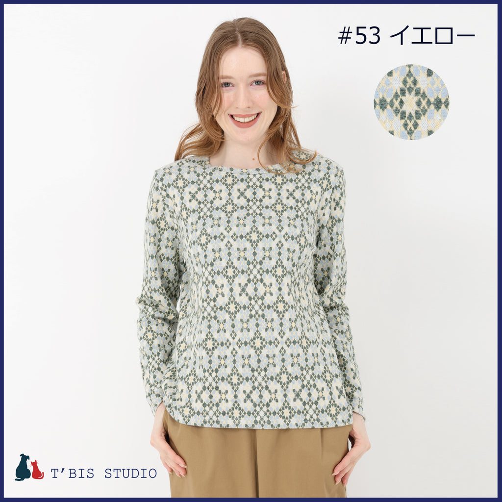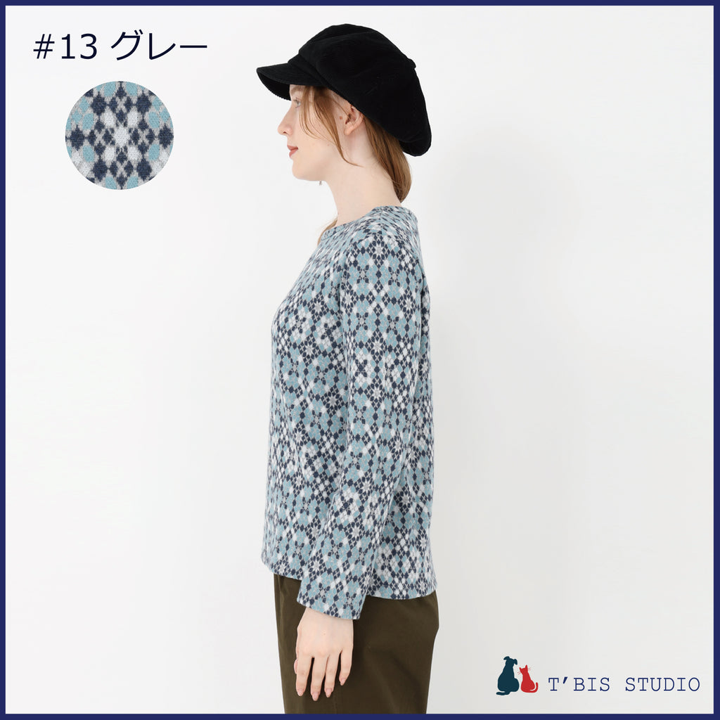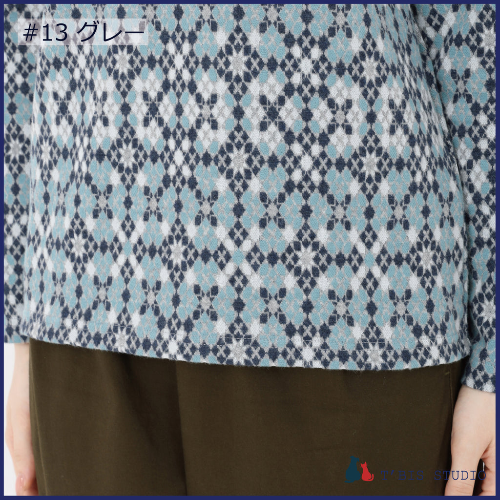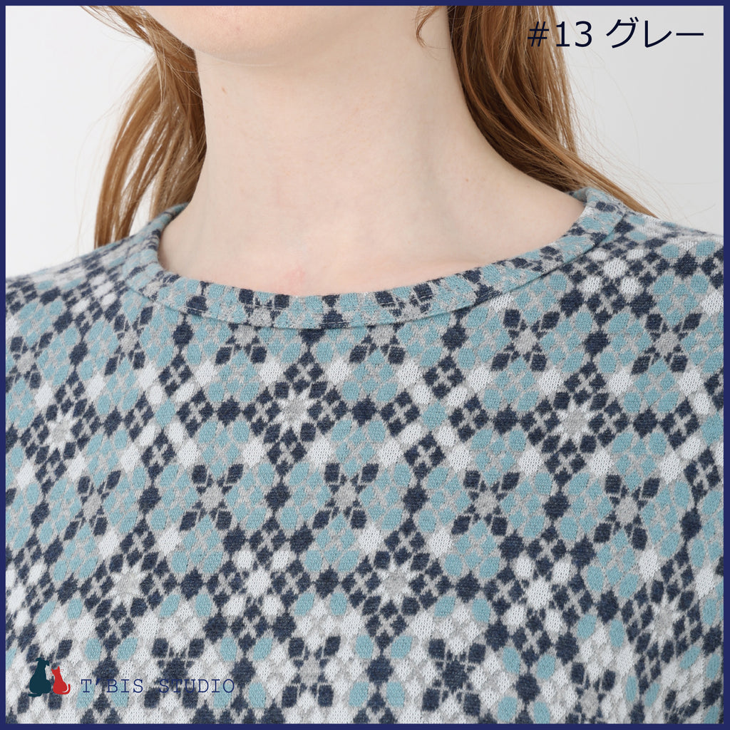 【日本製】長袖モザイク幾何柄微起毛Wジャカードクルーネックカットソー 157407