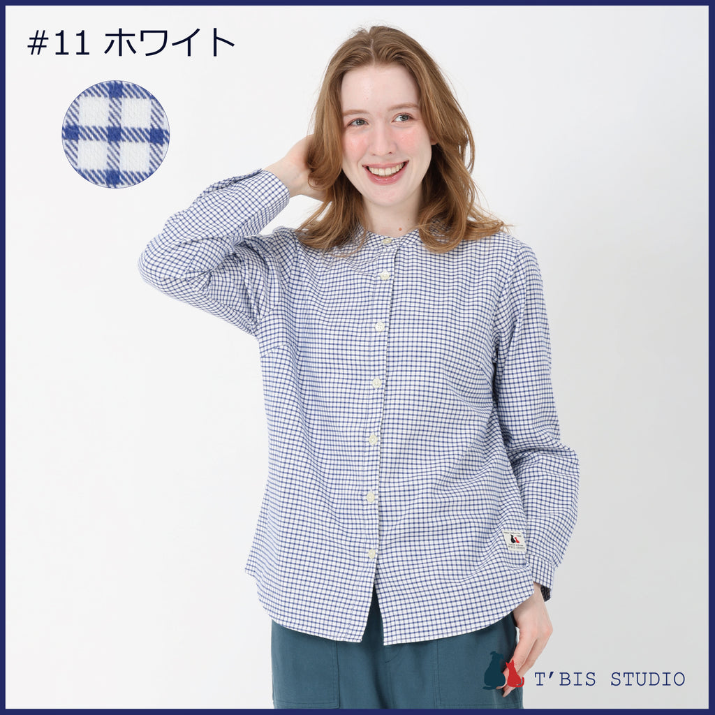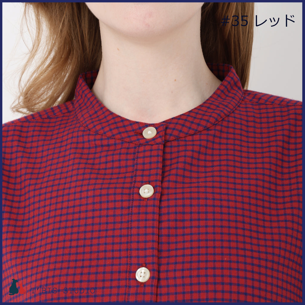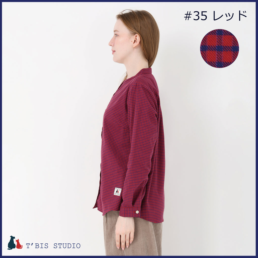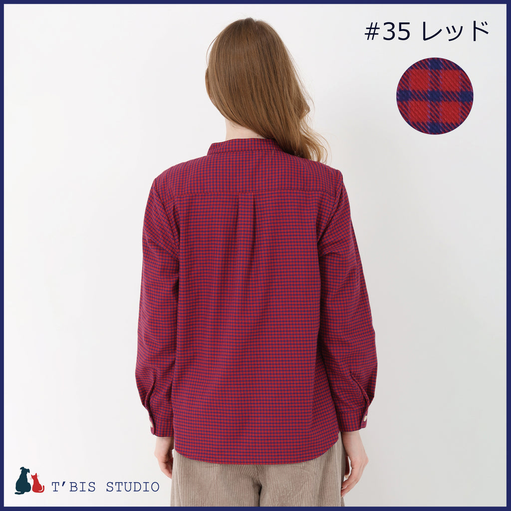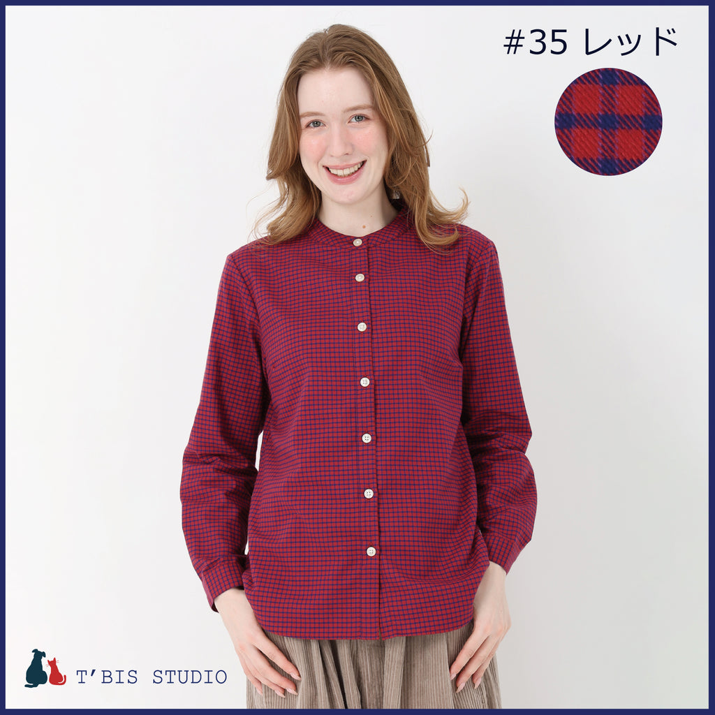 ・スタンドカラーがすっきりとした印象を与えるチェックシャツ。