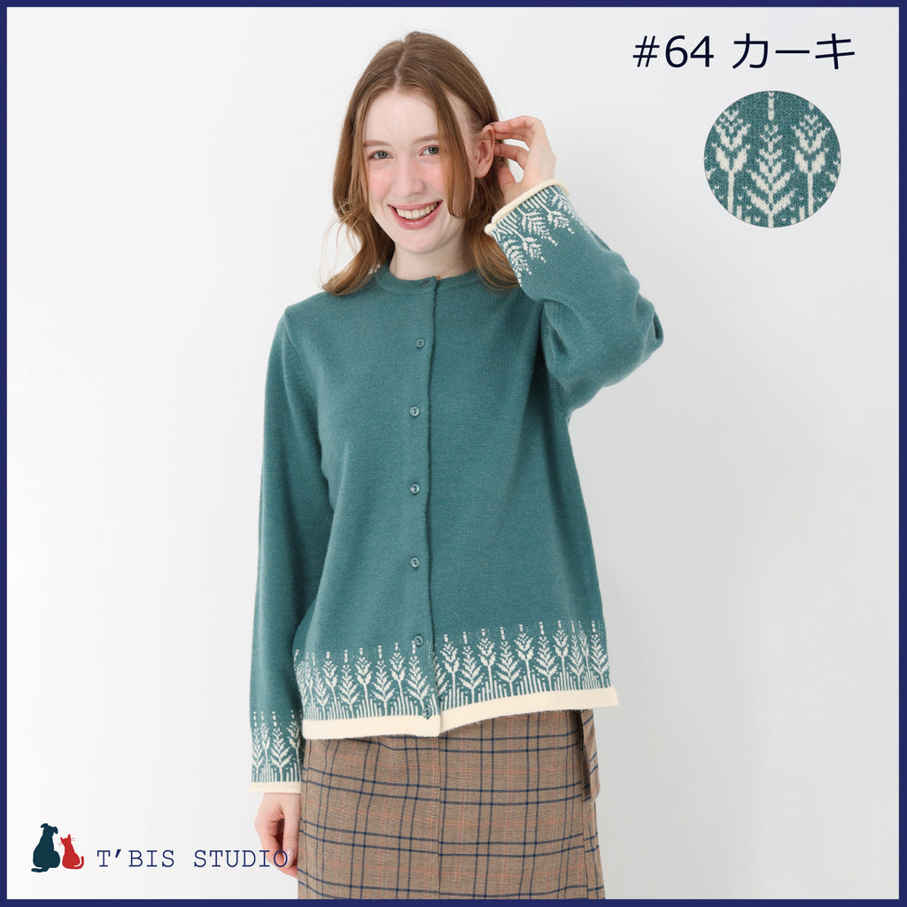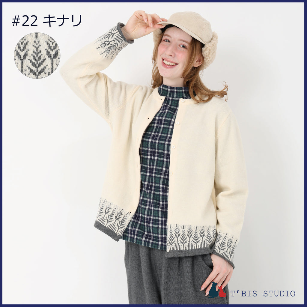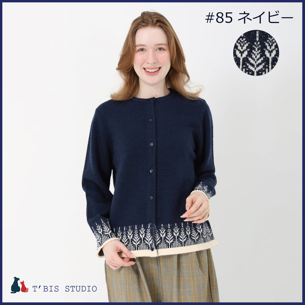 【LLサイズあり】長袖ウール混ムスカリ柄ジャガードカーディガン 158707