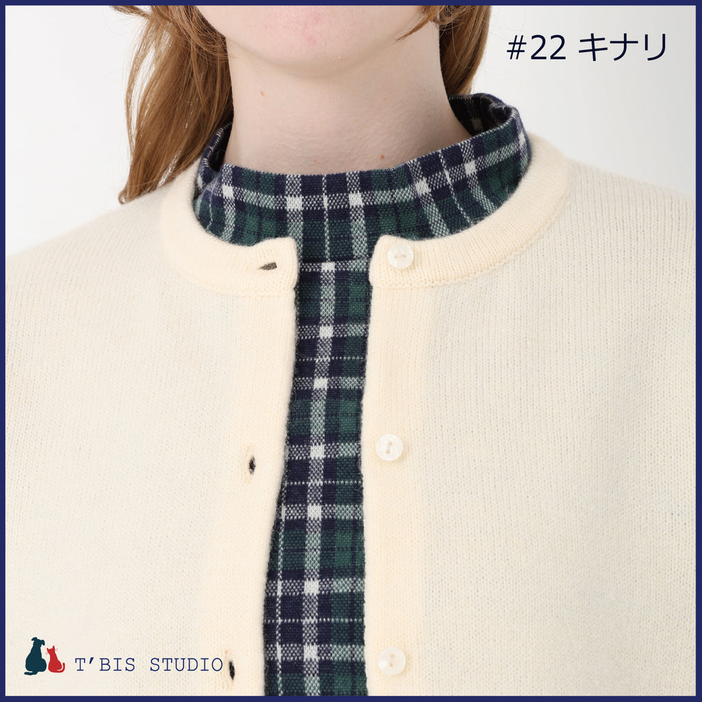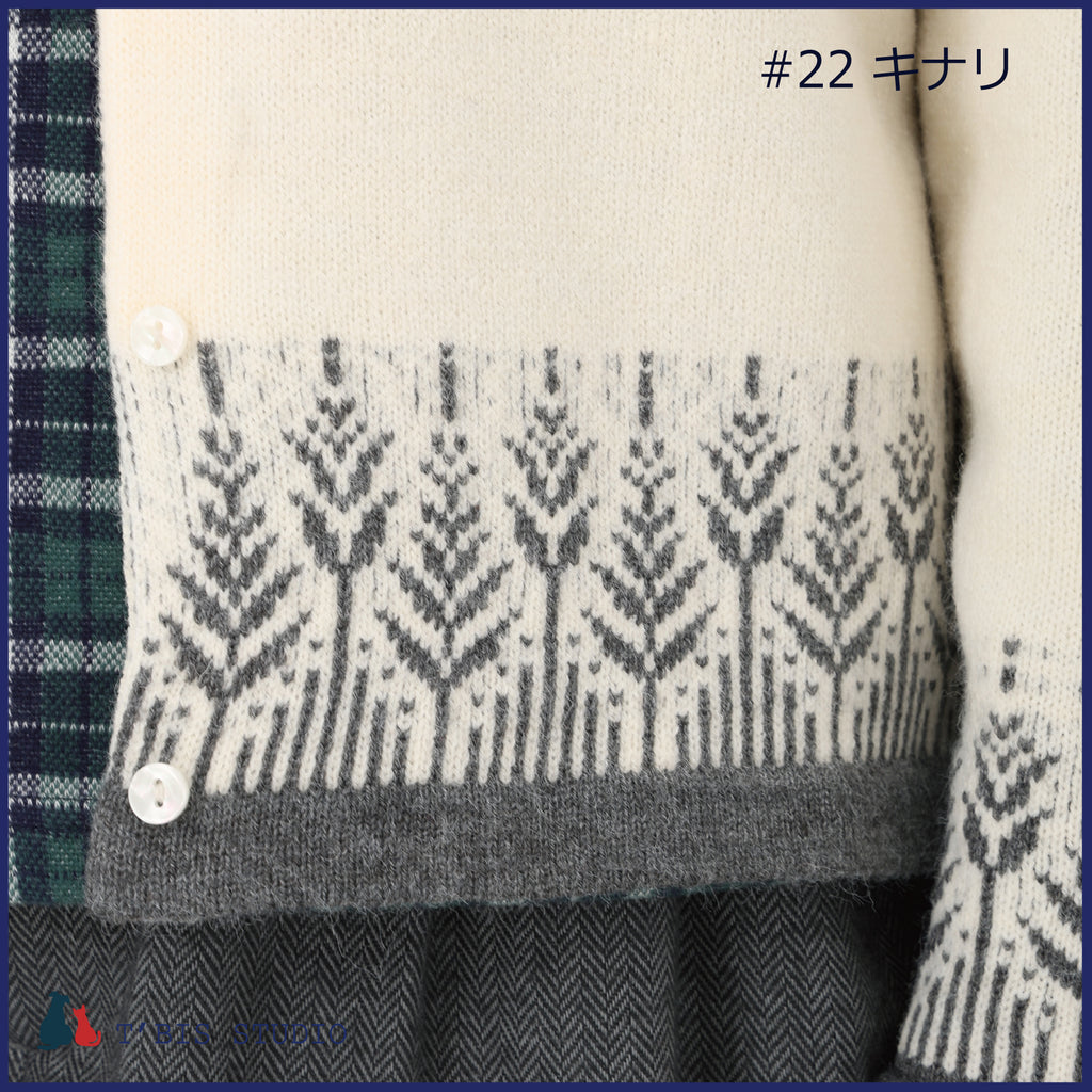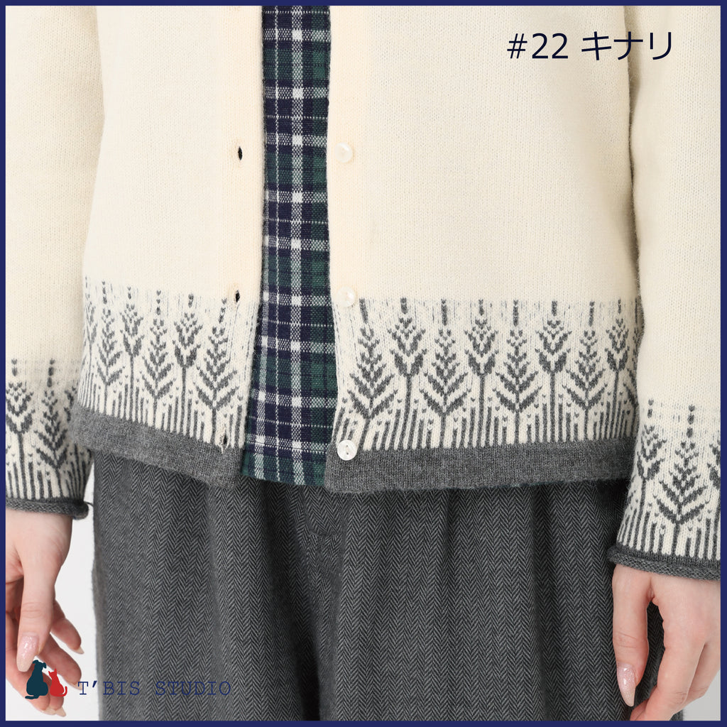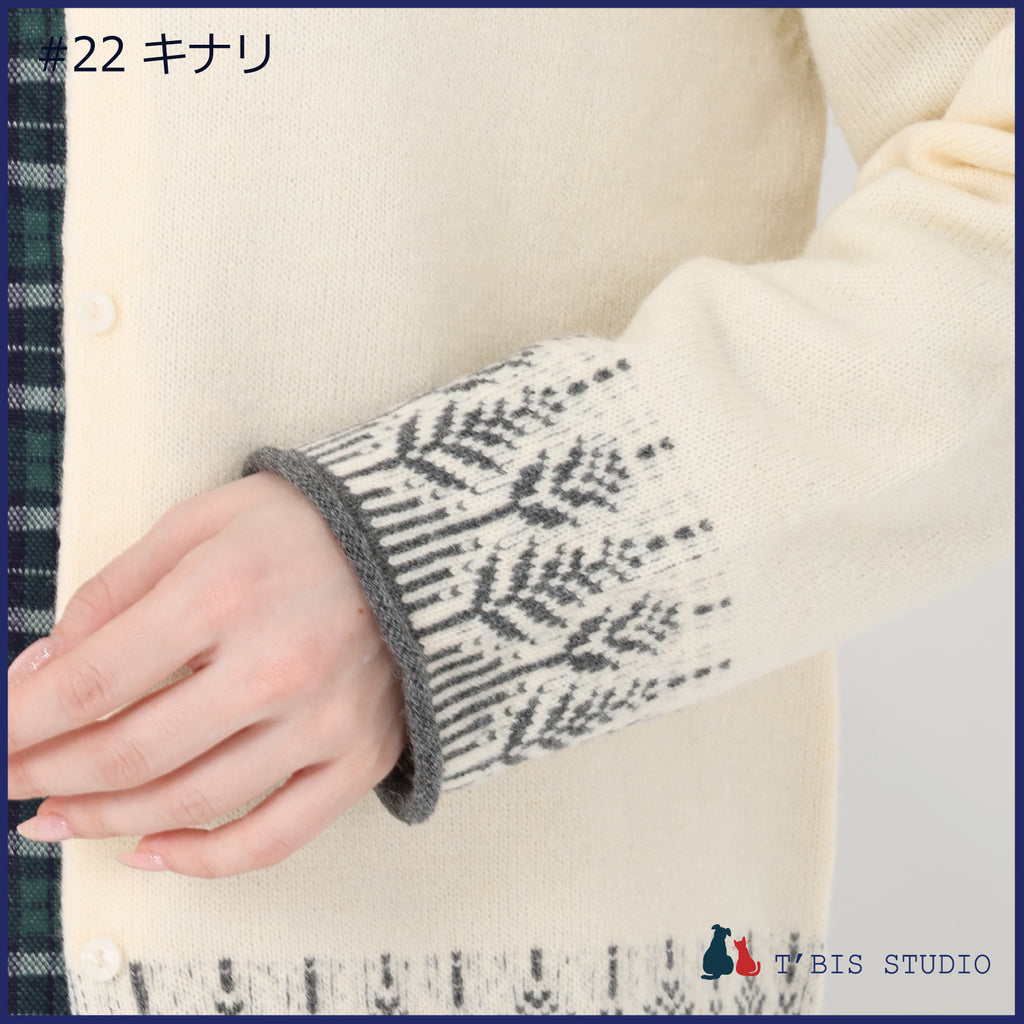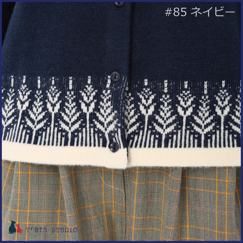 ・裾にムスカリ柄のジャガードと、袖口・裾を同色でトリミングした上品で存在感のあるニットカーディガンです。