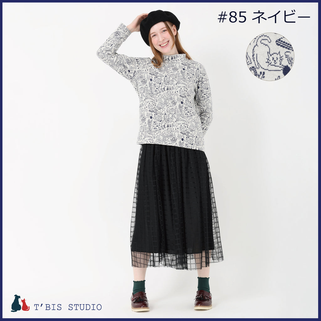 【LLサイズあり】【日本製】長袖テリア&ネコ起毛Wジャカード オフタートルチュニック 158404