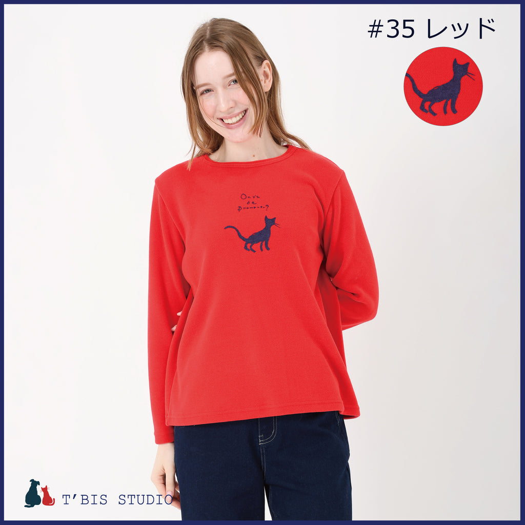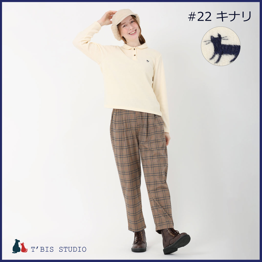 【日本製】起毛フレア鹿の子スムース ネコ刺繍長袖ポロシャツ 160501
